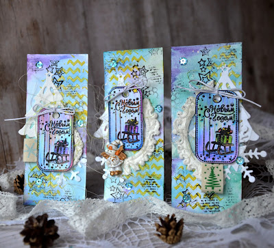 По заданию у меня родилось аж 3 небольших открыточки-тега. Я в них влюбилась еще на стадии акварельной покраски фона. Поэтому решила в итоге подарить их любимым клиентам перед Новым Годом) В работе использовала штампик "Звезды фоновый", "Соты" и "Новогодний ярлычок"
