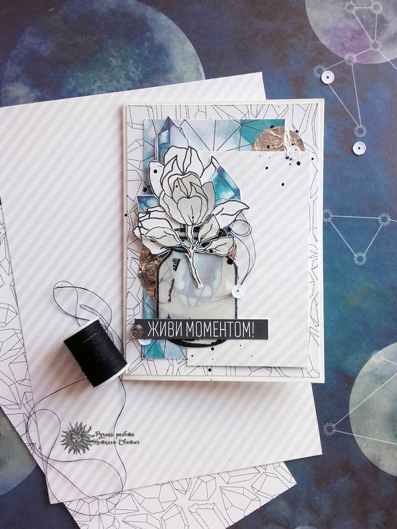 Всем привет))) Мне очень приятно творить для такого замечательного бложика, спасибо девочкам за приглашение! Задание для меня необычное, но тем интересней. У меня родилась открытка, очень свежая, лаконичная по палитре. Фольгу применила, как декоративный элемент. Также использовала штамп баночку производства "Арт-кладовая", решила, что эмбоссинг черной пудрой на кальке сюда отлично впишется. А еще в работе бумага от Фабрика Декору, немного черных ниток и пайетки. Рада была вдохновлять Вас, желаю всем креатива и выхода из зоны комфорта, это очень увлекательно!
