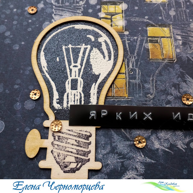 А основным акцентом является та же лампочка, но отштампованная комбинированным способом на чипборде. Цоколь лампочки отштампован на самом чипборде, а колба представляет собой эмбоссинг белой пудрой на мерцающем черном листе бумаги.